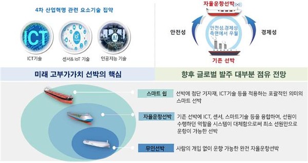 자율운항선박은 인공지능(AI)과 사물인터넷(IoT), 빅데이터, 센서 등을 융합해 선원의 의사결정을 지능화ㆍ자율화 한 시스템이 대체하는 차세대 고부가 가치 선박이다.