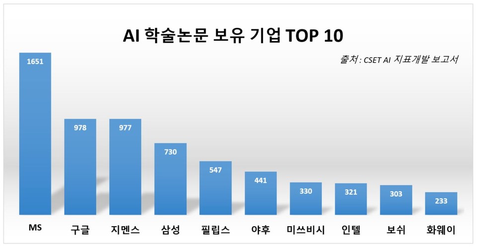 보고서에 따르면 MS는 AI 학술논문 1651개를 보유해 2위 구글(978개)과 큰 차이를 보였다. 유럽 최대 엔지니어링 회사 지멘스와 삼성이 각각 977개와 730개로 3, 4위를 차지했다. 필립스, 야후, 미쓰비시, 인텔, 보쉬, 화웨이 순으로 그 뒤를 이었다.