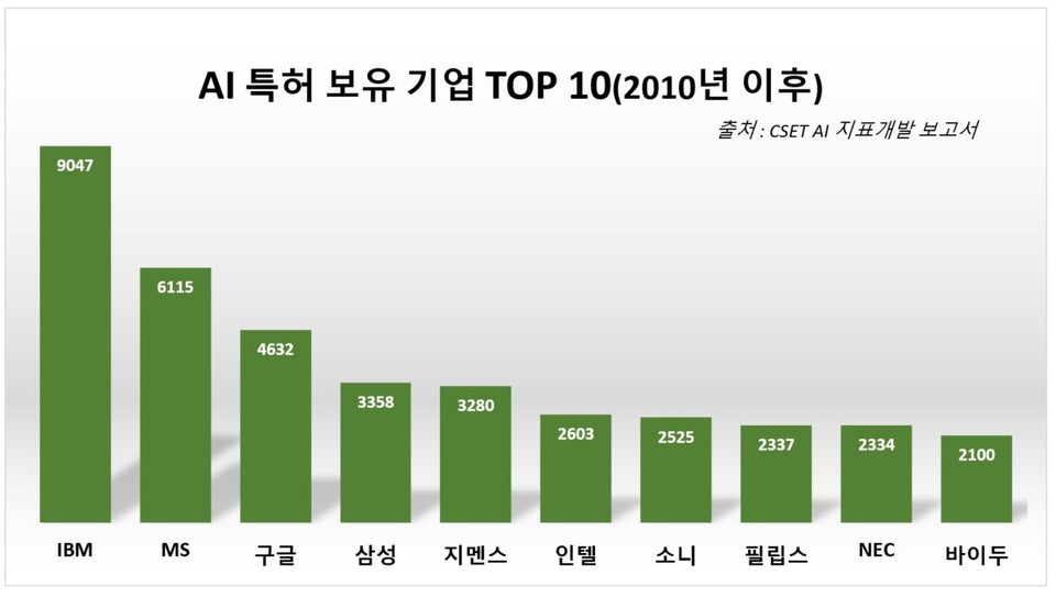 AI 특허는 IBM이 9047개로 압도적인 차이를 보이며 1위를 기록했다. AI 학술논문 보유 기업 상위 5개 기업안에 들었던 MS, 구글, 삼성, 지멘스가 AI 특허 보유수에서도 상위 기업 5개 안에 들었다. IBM의 뒤를 MS, 구글, 삼성, 지멘스 순으로 각각 6115개, 4632개, 3358개, 3280개를 기록했다. 인텔, 소니, 필립스, NEC, 바이두가 그 뒤를 이었다.