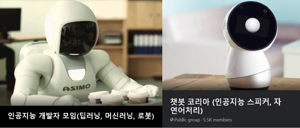 ▶ 챗봇 코리아(https://www.facebook.com/groups/ChatbotDevKR)는 5,500명의 회원들로 구성되어 있습니다. 대부분 챗봇이나 AI 스피커 및 자연어처리에 관심이 있는 분들입니다. 아무래도 인공지능의 세부 분야인 만큼, 보다 기술적인 측면에 집중합니다.