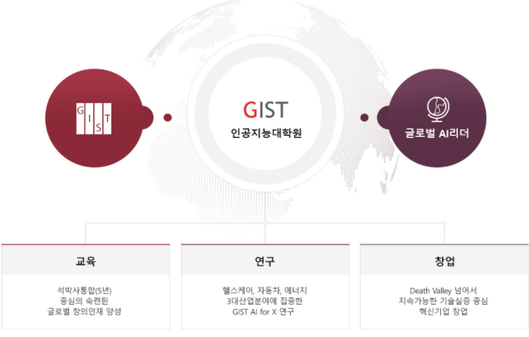 GIST 특징은 산업밀착형 전 생애주기 교육과정으로 운영된다는 점이다. 또 창업에 대비해 실증 중심의 AI 융합산업, 즉 'AI+X'라는 분야별 교육과 연구를 수행하도록 커리큘럼을 구성했다는 데 강점이 있다. AI 기초·핵심과목 수업부터 창업, 응용·확산까지 현장 중심 교육이 이뤄진다.