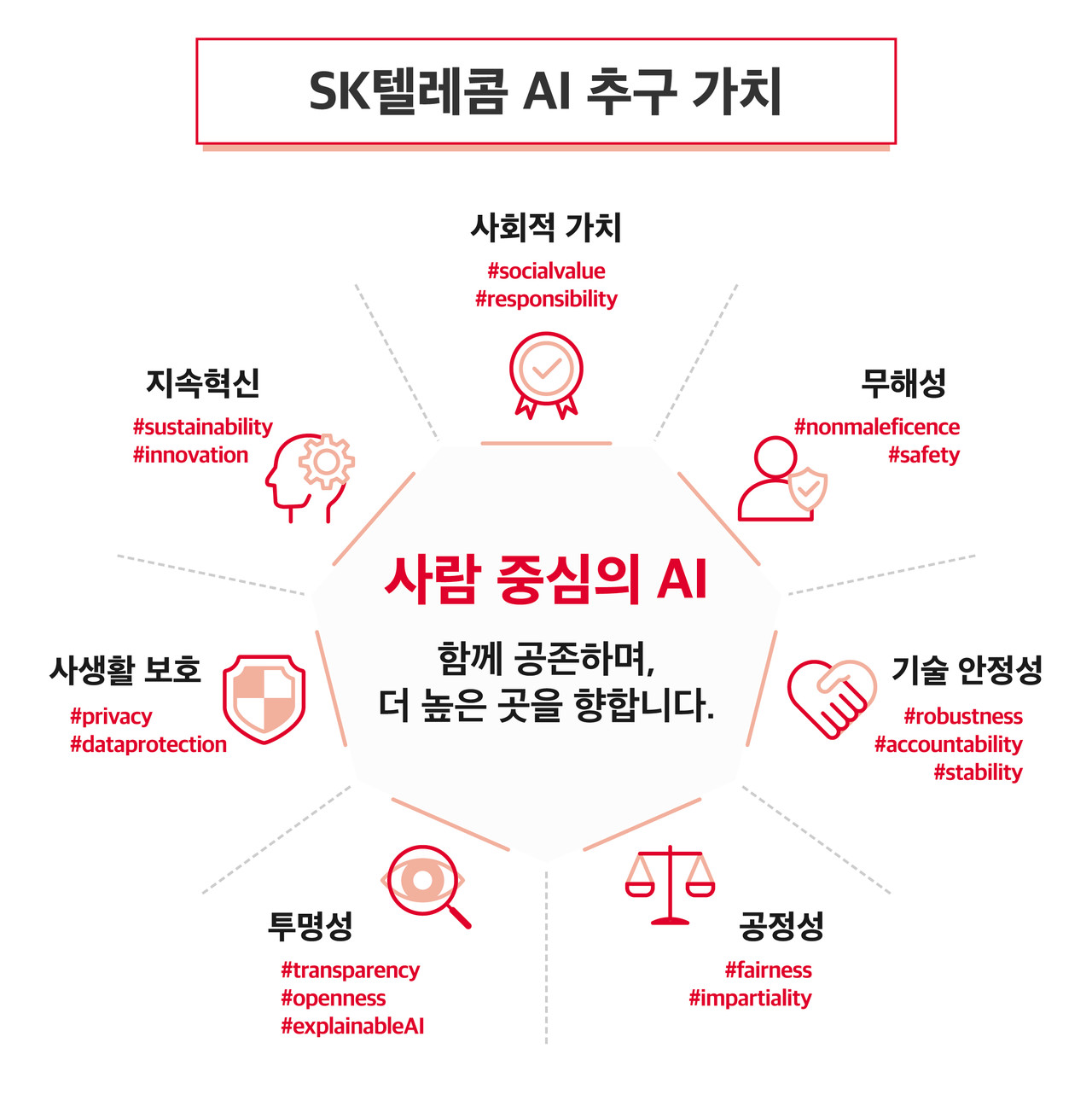 SKT가 13일 '사람 중심 AI'를 핵심 이념으로 하는 AI 추구 가치 제정을 선언했다. AI 회사로서 관련 혁신을 본격화해 사내 규정에 반영할 계획이다.