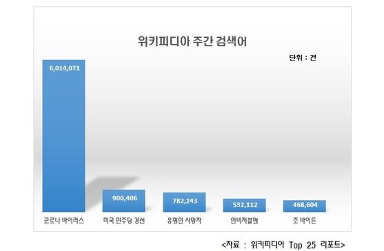 압도적이다. 위키피디아 'Top 25 리포트'는 주간 검색어 최고 순위에 3주 연속 '코로나'를 1위에 올려 놓았다. 특히 3월 둘째주에는 2위인 '미국 민주당 경선'과의 격차가 크게 벌어졌다. 지난주만 해도 110만건 정도 차이를 보이던 것이 이번주에는 500만건 이상의 차이를 보였다. 3위와 4위는 순위 바꿈이 일어났고, 5위 자리에는 마이클 블룸버그 전 뉴욕시장 대신에 조 바이든 전 미국 부통령이 이름을 올렸다.