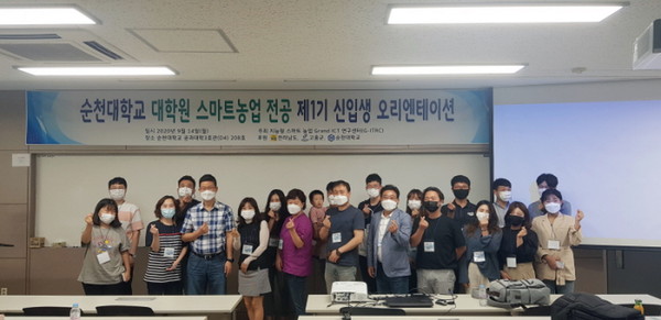 15일 순천대에 따르면 지능형 스마트농업 그랜드(Grand) ICT(이하 그랜드 ICT) 연구센터가 순천대학교 대학원 내에 스마트농업전공 과정을 개설했다. 최근 14일 순천대 공과대학 3호관에서 2020학년 2학기 1기 대학원생 23명을 대상으로 개강식·오리엔테이션 행사를 개최했다. 박기영 순천대학원 원장, 배창휴 생명산업과학대학 학장이 참석해 축사와 환영 인사를 전했다.