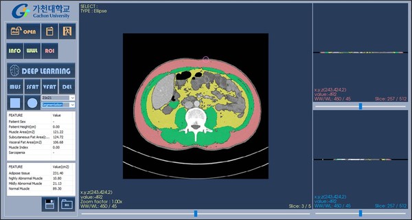 척추 측만 자동 예측 AI 프로그램에 대해서는 건강보험심사평가원 지원을 받아 연구를 진행해 연구 논문 3편으로 효과를 입증했다. 근감소증 진단 AI 소프트웨어는 김광기 교수가 10년간 몸담았던 암센터 경험에서 나온 기술이다. 김 교수는 “암센터 연구원 시절 암환자들이 항암제를 먹고 급격히 체중과 근육량이 줄어드는 것을 보고 관련 조치가 필요하다 생각했다. 암센터 당시 필리핀에서 연수를 온 의사와 함께 ROI 작업을 시작했고 가천대 영상의학과 교수가 관심을 가지면서 본격적으로 개발을 시작했다. 개발 초기 단계에서는 수학 모델을 사용하다가 딥러닝을 적용하는 방식으로 변경해 정확도를 크게 높였다”고 말했다.