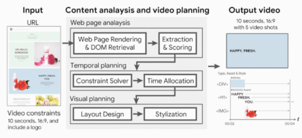 구글이 '2020 사용자 인터페이스 소프트웨어 및 기술 심포지엄'에서 선보인 `URL2Video`서비스는 웹페이지 주요항목을 자동 포착ㆍ분류해 페이지 내 콘텐츠의 배열체계를 반영한 후 사용자의 디자인 선호에 맞춰 비디오를 생성한다.