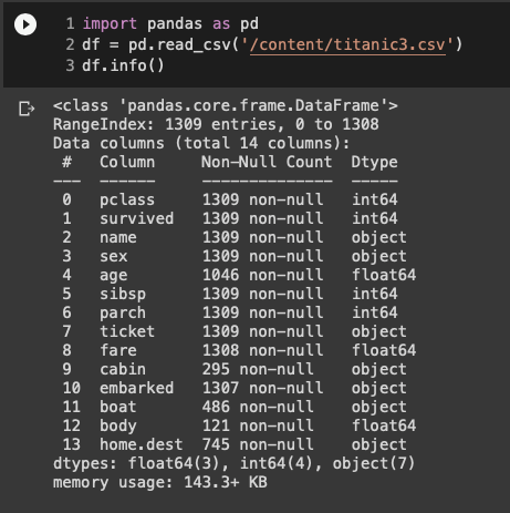 그 다음으로 확인할 수 있는 정보는 'Non-Null Count'로 데이터의 열에 비어있는 데이터의 개수를 짐작해볼 수 있다. 예를 들어 name의 경우 1309명 모두의 데이터를 갖고 있는 반면 age의 경우 1046명에 대한 정보만을 갖고 있는 것을 확인할 수 있다.