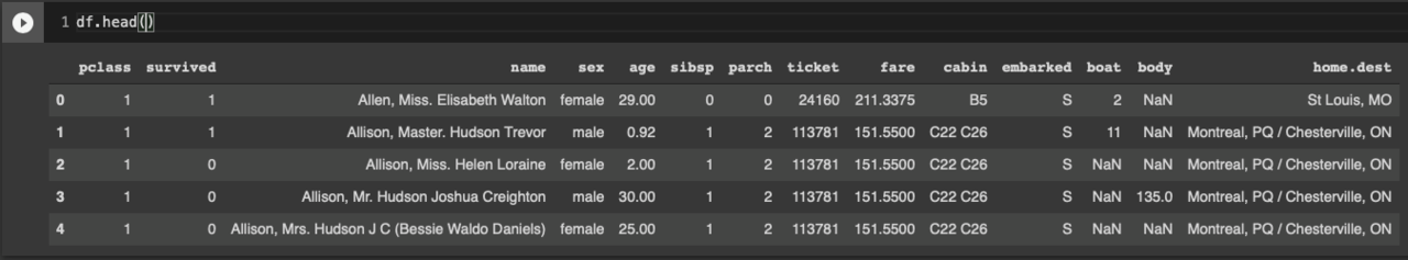 먼저 다운로드 받은 csv데이터를 불러와 데이터셋의 기본 정보를 살펴보자. 가장 먼저 확인할 수 있는 정보는 데이터셋의 크기와 형식으로 1309개의 행과 14개의 열을 갖고 있으며, 변수에 따라 object형태(여기서는 문자)와 int(정수), float(소수점을 포함한 숫자)형식의 데이터를 갖고 있는 것을 알 수 있다. 각 열에 대한 정보는 변수의 이름으로 어느 정도 추측이 가능하며, 변수에 대한 자세한 설명(http://biostat.mc.vanderbilt.edu/wiki/pub/Main/DataSets/titanic3info.txt)을 참고하자.