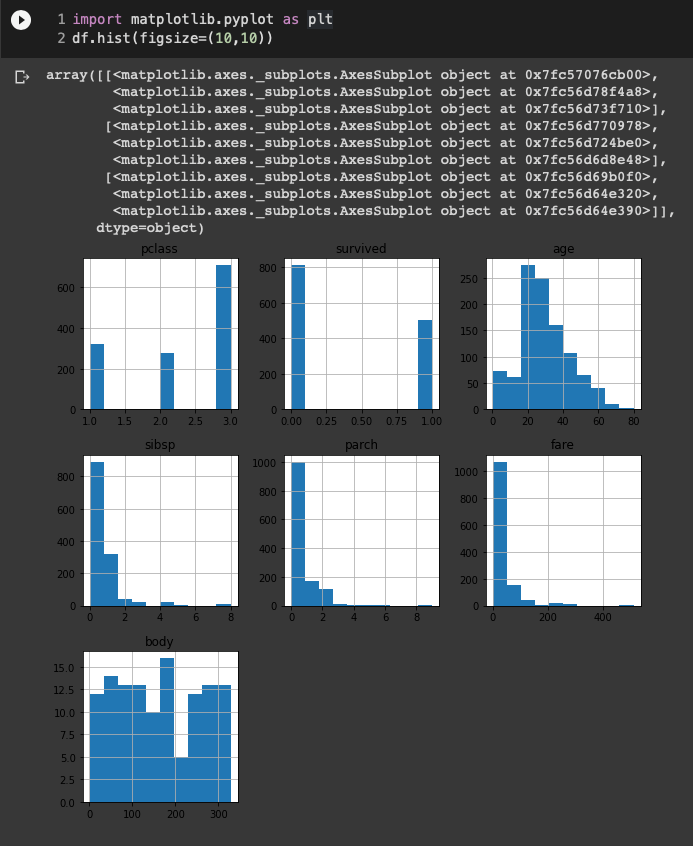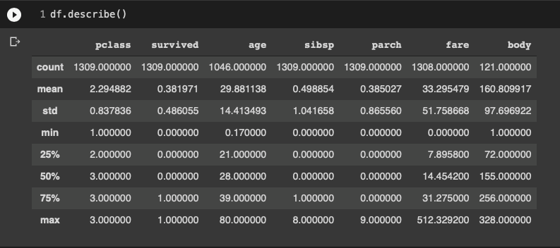 다음은 수치형 데이터를 갖고 있는 변수들의 기초 통곗값을 확인한 결과다. age 변수를 보면 희생자가 0.17세부터 80세까지 있었다는 것을 알 수 있다. 또 sibsp(siblings and spouse, 동승한 형제자매와 배우자 수)와 parch(parent and children)을 통해 많은 가족이 함께 승선한 경우도 있었다는 것을 알 수 있다. 하지만, 지금까지의 정보만으로 실제 데이터 분포나 이상값(outlier)이 있는지 확인하기 어렵다.