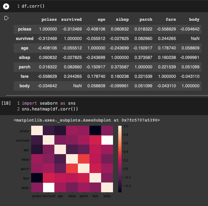 우선 목적변수 survived와 어떤 변수가 상관관계가 높은지 살펴보면 양의 상관계수가 0.244265로 fare와 가장 큰 양의 상관관계를 갖는 것을 알 수 있으며 pclass와 -0.312469의 가장 큰 음의 상관관계를 갖는 것을 알 수 있다.