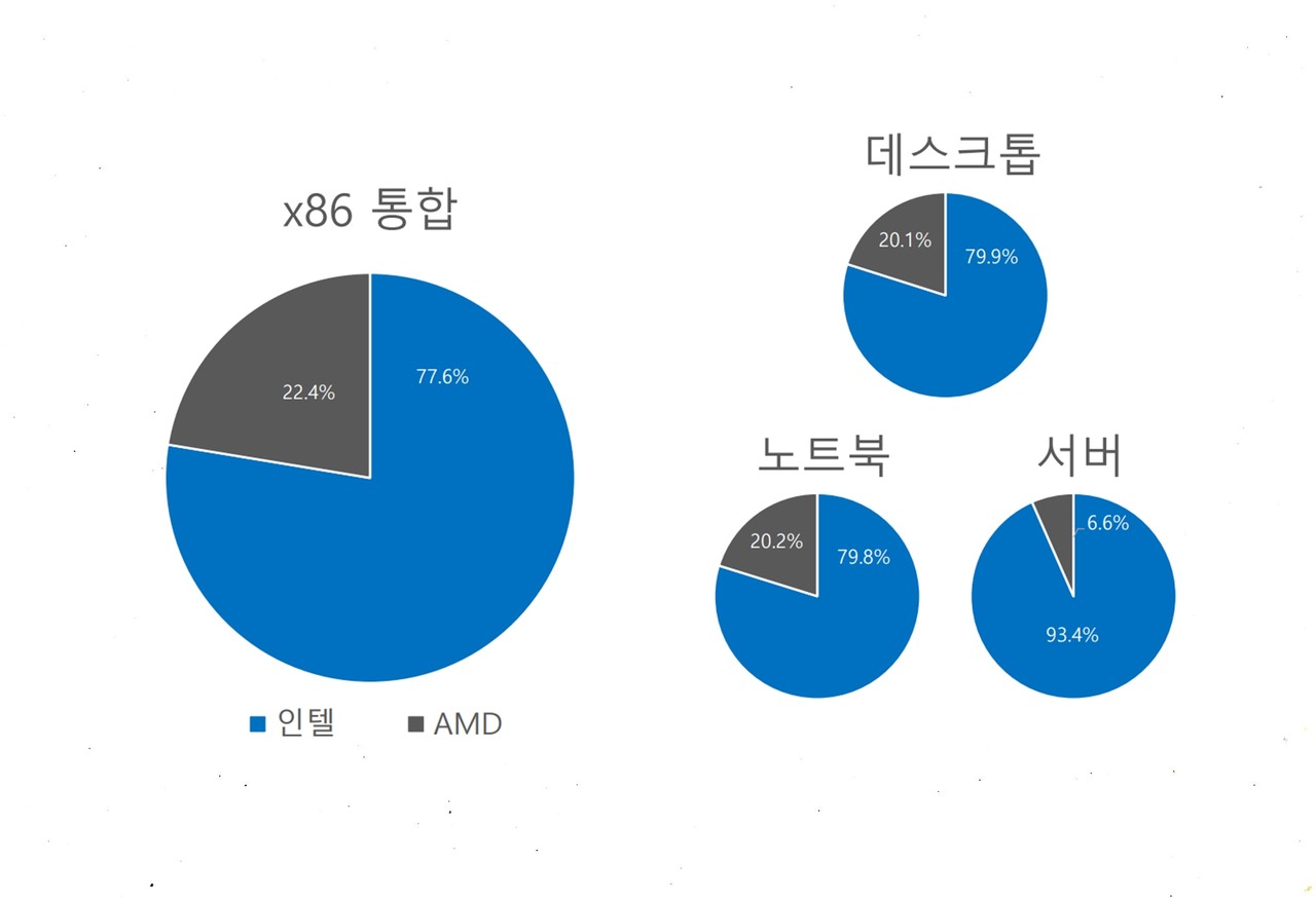 데스크톱 시장(IoT 제외)에서는 인텔 79.9%, AMD 20.1%를 각각 기록했다.