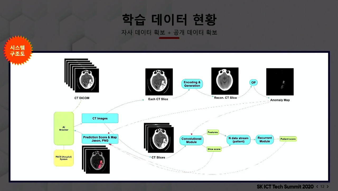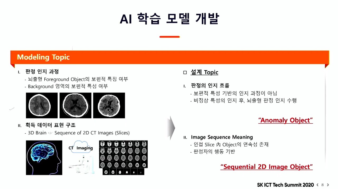 SK C&C가 자체 개발 의료·바이오 AI 시스템에 대한 세부 사항을 공개했다. 11월 4일부터 5일까지 열린 ‘SK ICT TECH SUMMIT 2020’에서는 SK C&C가 개발한 영상 판독 AI 모델과 신약개발을 위한 AI 접목 타겟 발굴 서비스를 연구원이 직접 소개했다. 임홍규, 김재협 연구원은 뇌출혈 영상 판독 AI 모델 개발 과정과 알고리즘, 작동 원리를 발표했다.