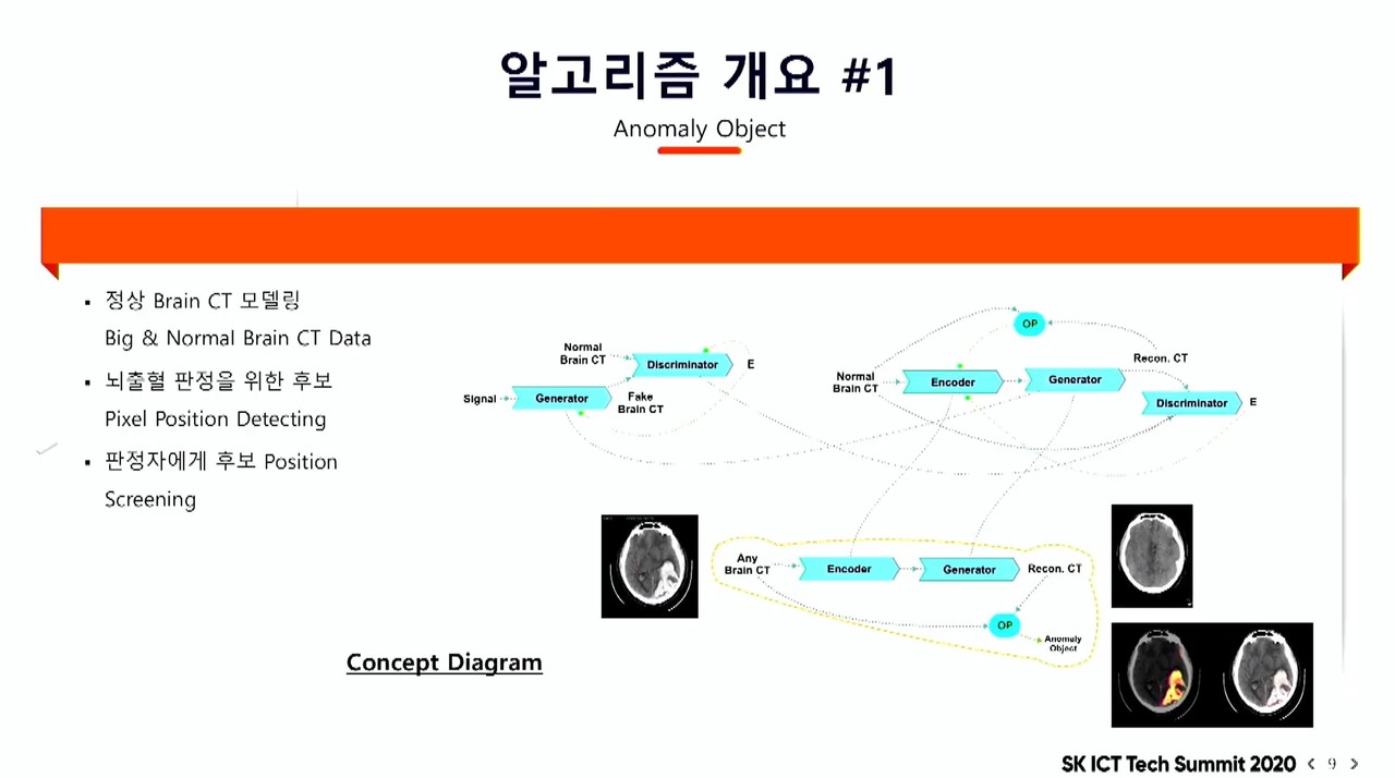 첫 번째 알고리즘 개요에서는 먼저 제너레이터(Generator)가 정상인 뇌 CT 분포에 대한 학습을 수행한다. 동시에 인코더(Encoder)가 비정상 신호와 정상인 뇌 영상 간 관계를 자동 학습한다. 이후에는 앞쪽 단에서 학습한 디스크리미네이터(Discriminator)가 붙어 학습을 돕는다. 결론적으로 인코더와 제너레이터가 오코인코더로 구조화해 비정상 예측 모델을 구축한다.