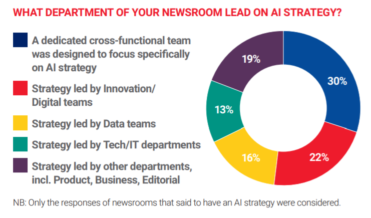 LSE가 펴낸 저널리즘과 인공지능(AI) 보고서 '새로운 권력, 새로운 책임: 저널리즘과 인공지능 국제 설문 조사(New powers, new responsibility: A global survey of journalism and artificial intelligence)'에 따르면, 조사대상의 63%는 "인공지능 관련 전략이 없다"고 답했다. (보고서 내용 요약 기사 링크)