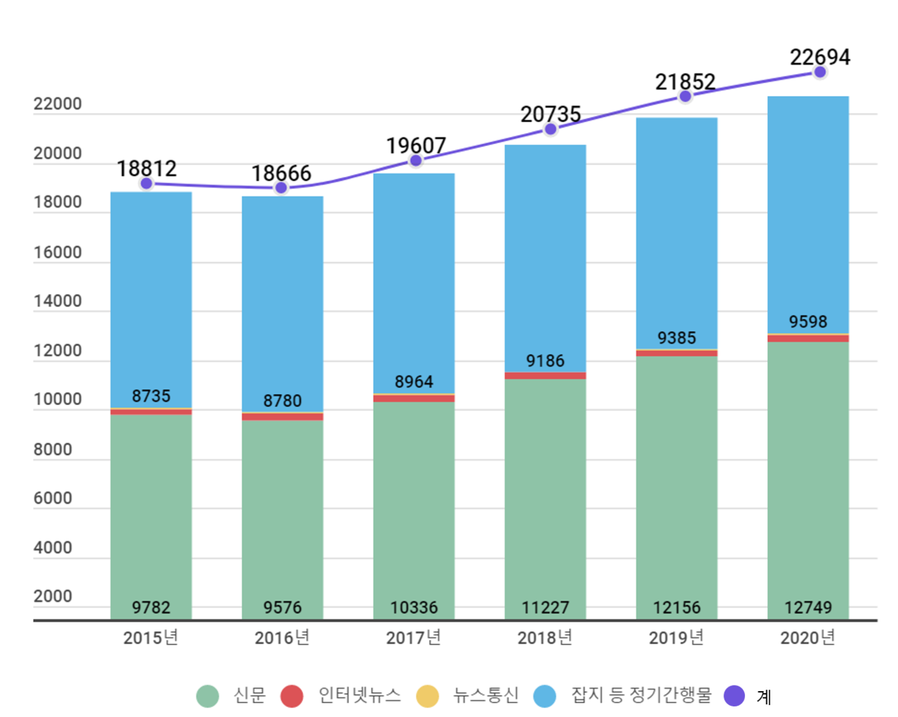 디지털 기술 발달에 힘입은 인터넷미디어 등 국내 미디어 양적 팽창은 눈부시다. 11월 현재 문화관광부에 등록된 미디어는 2만2694개(링크). 이들 미디어는 물론, 파워블로거ㆍ유튜버 등 1인 미디어가 생산하는 뉴스를 포함한 뉴스 생산량 증가추이는 폭발적이다.