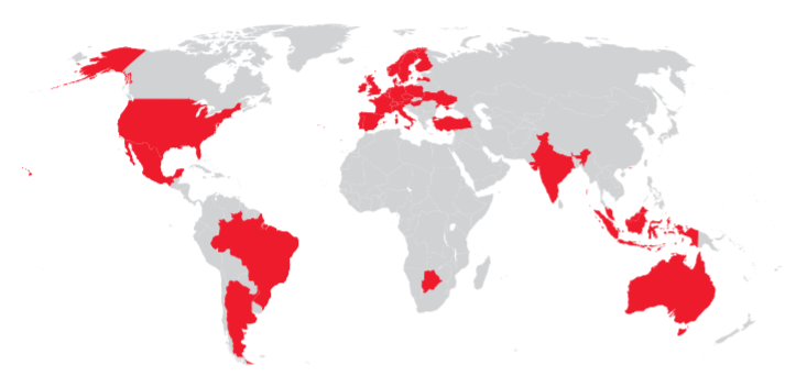 저널리즘AI 연구소 조사에 참여한 대표 국가는 아래 그림과 같다. 미국, 남미, 유럽, 호주, 인도, 일부 동남아시아 국가들이 참여했다. 한국, 중국을 비롯해 대부분의 아시아 국가들은 포함되어 있지 않다.