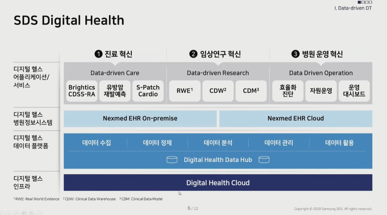 삼성SDS 플랫폼은 이 여러 기관 데이터를 포괄한다. 대형병원에서는 보다 많은 데이터를 통합하고 소규모 의료기관에서는 인프라 부족 문제를 보완할 수 있다. 특히 CDW는 현재 일부 병원에서만 자체 보유한 상황인데 자체 구축이 어려운 병원도 SaaS 형태로 사용 가능하다”고 설명했다.