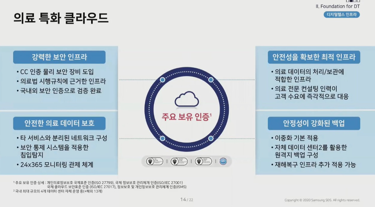 조영희 삼성SDS 수석은 12일 ‘2020 대한의료정보학회 추계학술대회’에서 자사 의료 IT 서비스 전반을 공개했다. 삼성SDS 의료 특화 클라우드는 사용자인 의료진에 맞춘 기능을 제공한다. 먼저 병원 인증 평가 기준 충족을 위한 정보보호 관리 체계를 갖췄다.