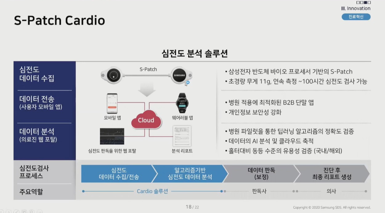 심전도 분석 서비스인 ‘S-패치 카디오(S-Patch Cardio)’는 의료기기·앱과 연동한 AI 솔루션이다. 신체 신호를 감지하는 센서는 초경량인 11g으로 몸에 부착한 상태로 활동이 가능하다. 실시간 모니터링으로 모바일 앱과 중앙시스템에 신호를 전송하고 딥러닝 알고리즘이 이상반응을 감지해 경고를 전한다.