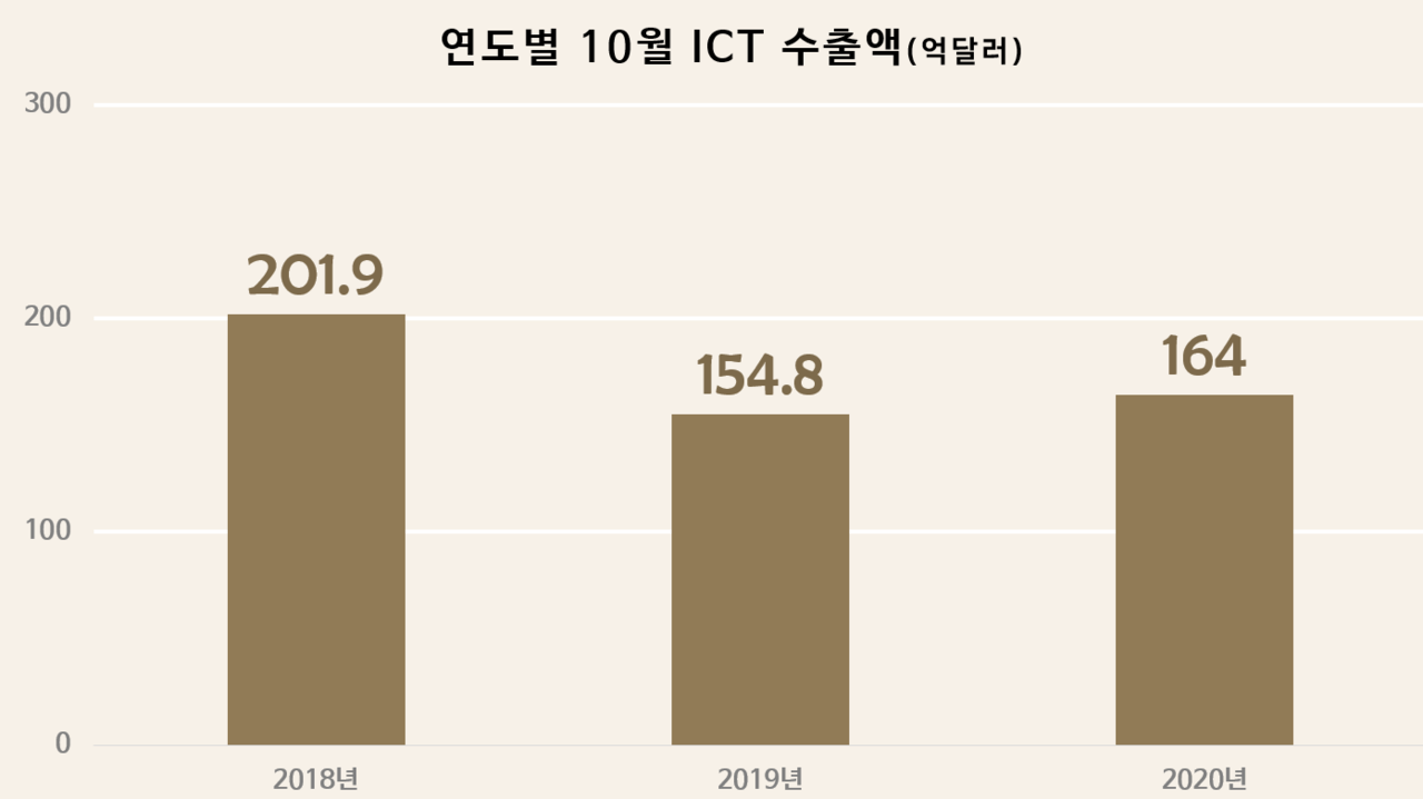 올해 ICT 무역 수출 규모는 지난 4월 128억7000만달러 이후 9월 176억3000만달러까지 5개월 연속 상승세를 유지했으나 10월 수출 규모가 전월 대비 6% 감소한 164억달러를 기록하며 ICT 수출 상승세를 이어가지 못했다.