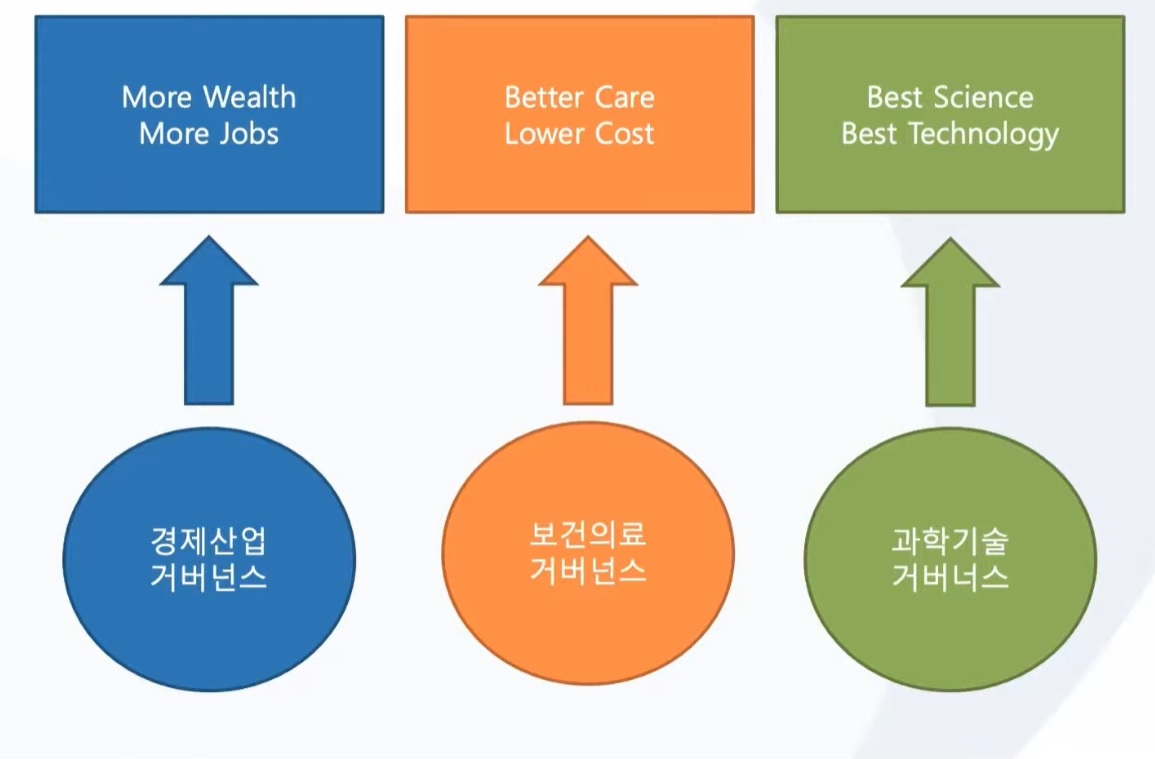 의료서비스에서 가장 우선시해야할 보다 나은 케어와 낮은 의료비용이라는 가치인데, 경제산업 거버넌스에서는 더 많은 수익과 일자리 창출, 과학기술 측에서는 과학과 기술 발전이 최우선이라는 것이다.