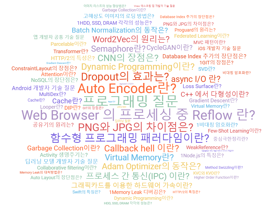 딥러닝 질문은 "Gradient Descent란?", "CNN의 장점은?" 등의 이론적인 질문을 포함해 "Adam Optimizer란?" "CycleGAN이란?"등 응용되는 알고리즘에 대해 묻는다.