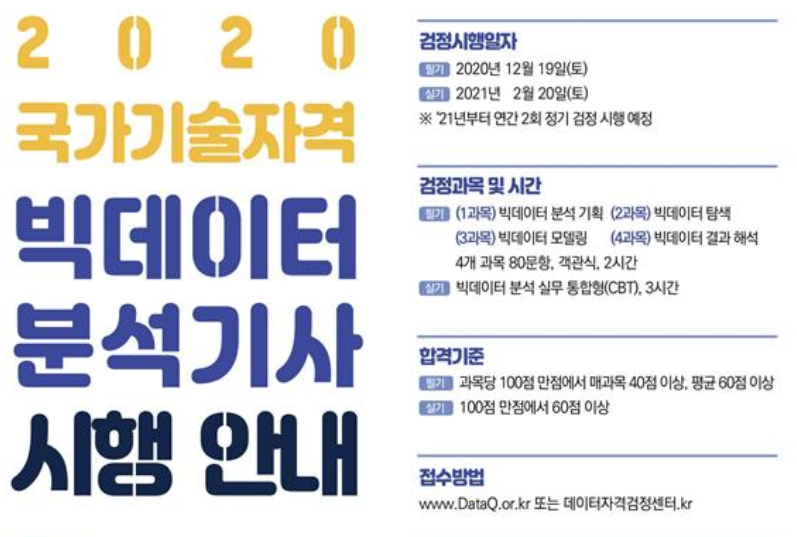 빅데이터 분석기사 자격 검정은 빅데이터 분야에서 처음 시행한 국가기술자격이다. 디지털 뉴딜의 핵심 기반인 데이터 산업의 활성화와 빅데이터 전문가 양성을 목표로 지난 해부터 과기정통부가 통계청과 공동 자격 신설을 추진했다.