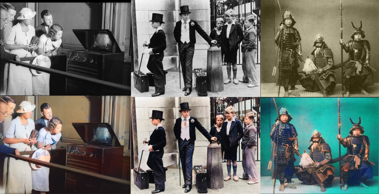 디올디파이(DeOldify) 툴은 생정적 AI로 흑백 영화나 사진에 생기를 불어넣는 색을 입힐 수 있다. 디올디파이는 바다, 하늘 등 텍스쳐 위주 클래스만 성공적으로 생성하는 기존 GAN의 단점을 보완한 Self-attention GAN을 이용해 흑백사진에 알맞은 색깔을 입혔다. (Google Colab에서 사용해볼 수 있다) 흑백사진으로부터 ‘색이 있는 과거 사진’이라는 새로운 콘텐츠를 생산한다.