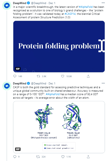 딥마인드 CEO 데미스 하사비스(Demis Hassabis)가 본인의 계정을 통해 공유한 알파폴드2 성과에 관한 게시물도 2천건 이상 공유ㆍ8천건 이상 관심을 받았다.