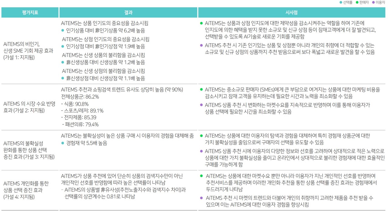 에이아이템즈 효과 검증을 위해 4개 가설 설정 후 연구를 진행한 결과 모든 가설이 일리가 있음을 확인했다. 4개 가설은 ▲SME(중소상공인) 기회제공 효과 ▲시장수요 반영 효과 ▲상품 불확실성 완화를 통한 상품 선택 증진 효과 ▲개인화 추천의 상품 선택 증진 효과다.