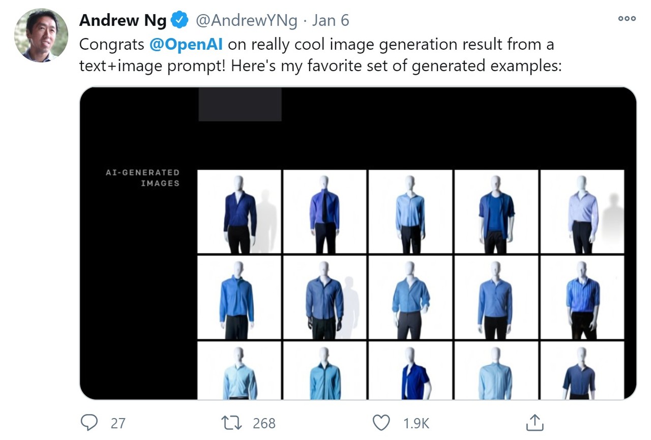 오픈AI의 DALL·E 발표 소식에 전세계 AI 연구계가 들썩이고 있다. 대표적인 AI 석학인 스탠포드대 앤드류 응 교수는 6일(현지시각) 오픈AI DALL·E 소식을 개인 트위터에 공유하며 찬사를 보냈다.