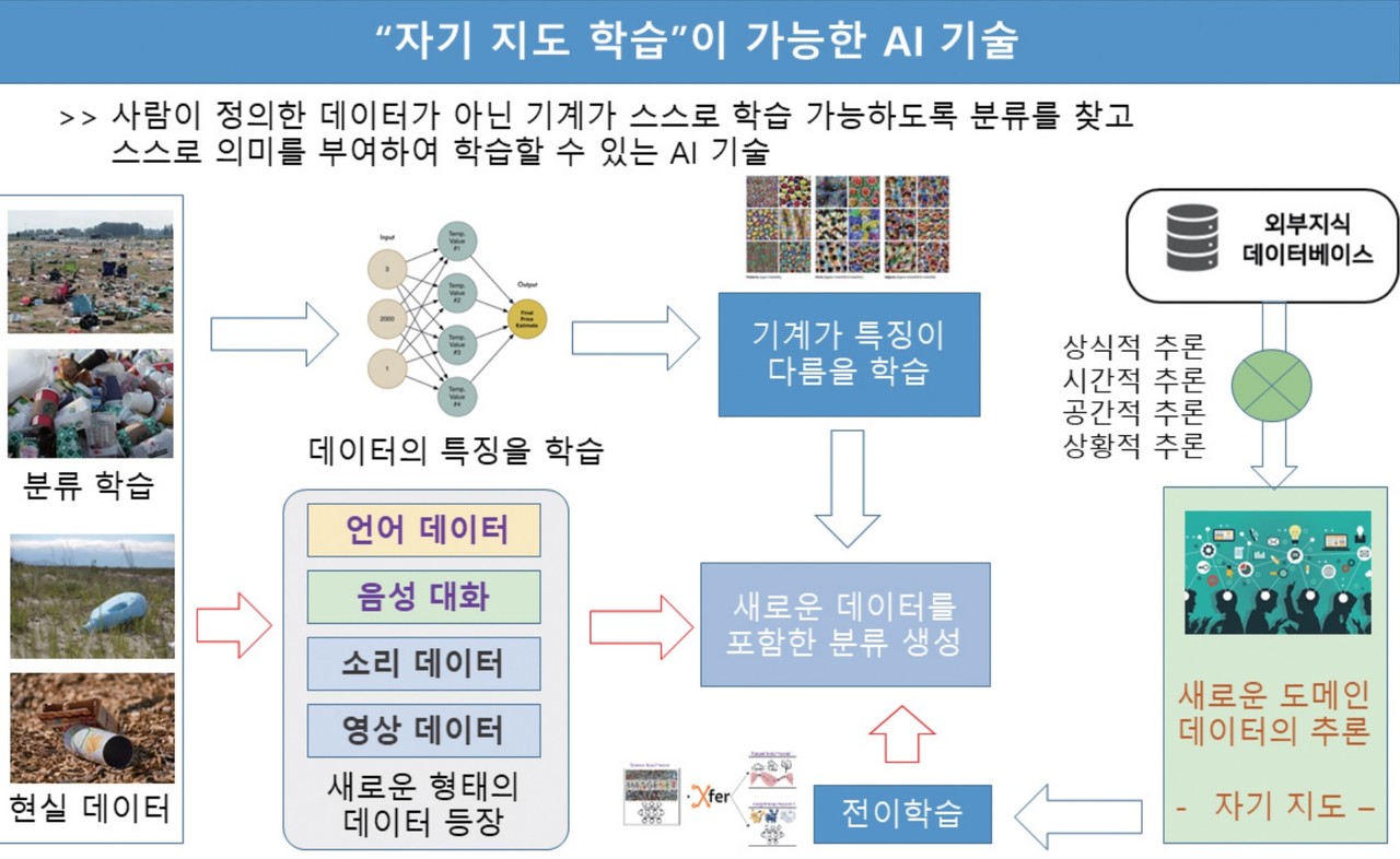자기지도학습은 깊이성장 AI의 하나로, AI 스스로 학습 데이터에 없는 정의와 규칙을 찾아 분류, 의미를 부여한다.