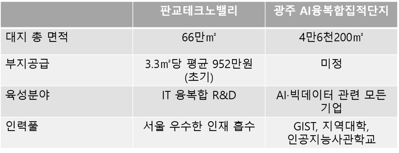 '인공지능 중심도시 광주' 인공지능(AI) 집적단지 조성사업의 성공을 위해 적절한 부지 제공, 특화 분야 집중 육성, 고급인력 확보 3박자가 시급히 이뤄져야 된다는 지적이다. 이에 '한국판 실리콘밸리'로 불리는 판교의 성공사례에서 교훈을 찾아봐야 한다는 제안이 나오고 있다.