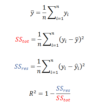 즉, 위 그림과 같이 R2 값은 평균값으로 예측을 했을 때의 오차의 제곱의 합(붉은 색 사각형의 면적)과 실제 우리가 예측한 모델(f)의 오차의 제곱의 합(파란색 사각형의 면적)을 비교한 값의 비율로 표현되며 해석의 편의를 위해 1에서 뺀 형태로 나타낸다. 따라서 모델이 모든 데이터를 완벽하게 설명하게 된다면 파란색 면적이 0이 되고 R2 값은 1을 갖게 된다.