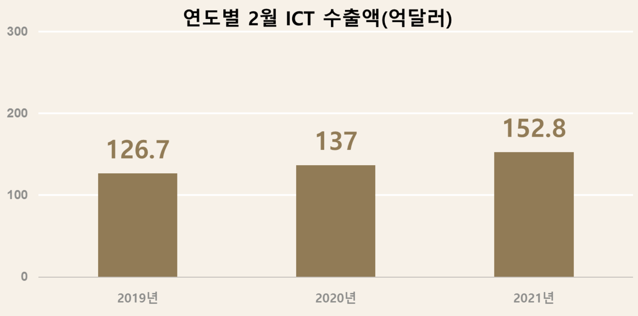 2월 정보통신기술(ICT) 분야 수출 규모가 전년 동월 대비 11.5% 증가한 152억8000만달러를 기록했다. 역대 2월 수출액 중 2번째로 높은 수출 실적이다. 2월 통계 최고 수출액 달성한 해는 2018년으로 156억8000만달러를 기록한 바 있다.