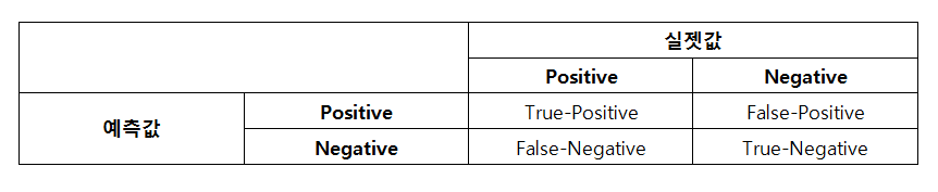 Positive를 Positive로 분류한 경우(True-Positive)와 Negative를 Negative로 분류한 경우(True-Negative)는 모델이 제대로 작동한 경우일 것이며, Positive를 Negative로 분류(False-Negative)하거나 Negative를 Positive로 분류(False-Positive)한 경우 에러라고 생각할 수 있다.