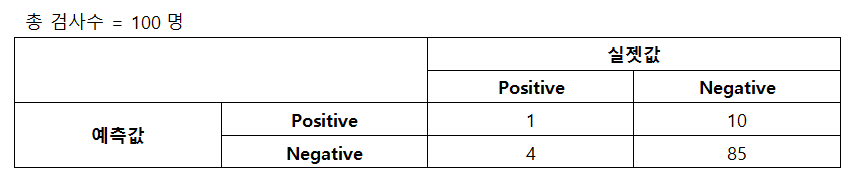 이때 정확도는 (4+85)/100=90%가 된다. 100점 만점에 90점의 점수는 우수한 점수라고 생각할 수 있다. 하지만 실제 코로나19에 감염된 사람을 얼마나 잘 찾아냈는지(True-Positive) 확인해보자. 100명 중 실제 감염자는 5명이었으며 이때 검사를 통해 1명은 감염자를 발견했지만 4명의 감염자를 비감염자로 분류하는 오류가 나타났다.