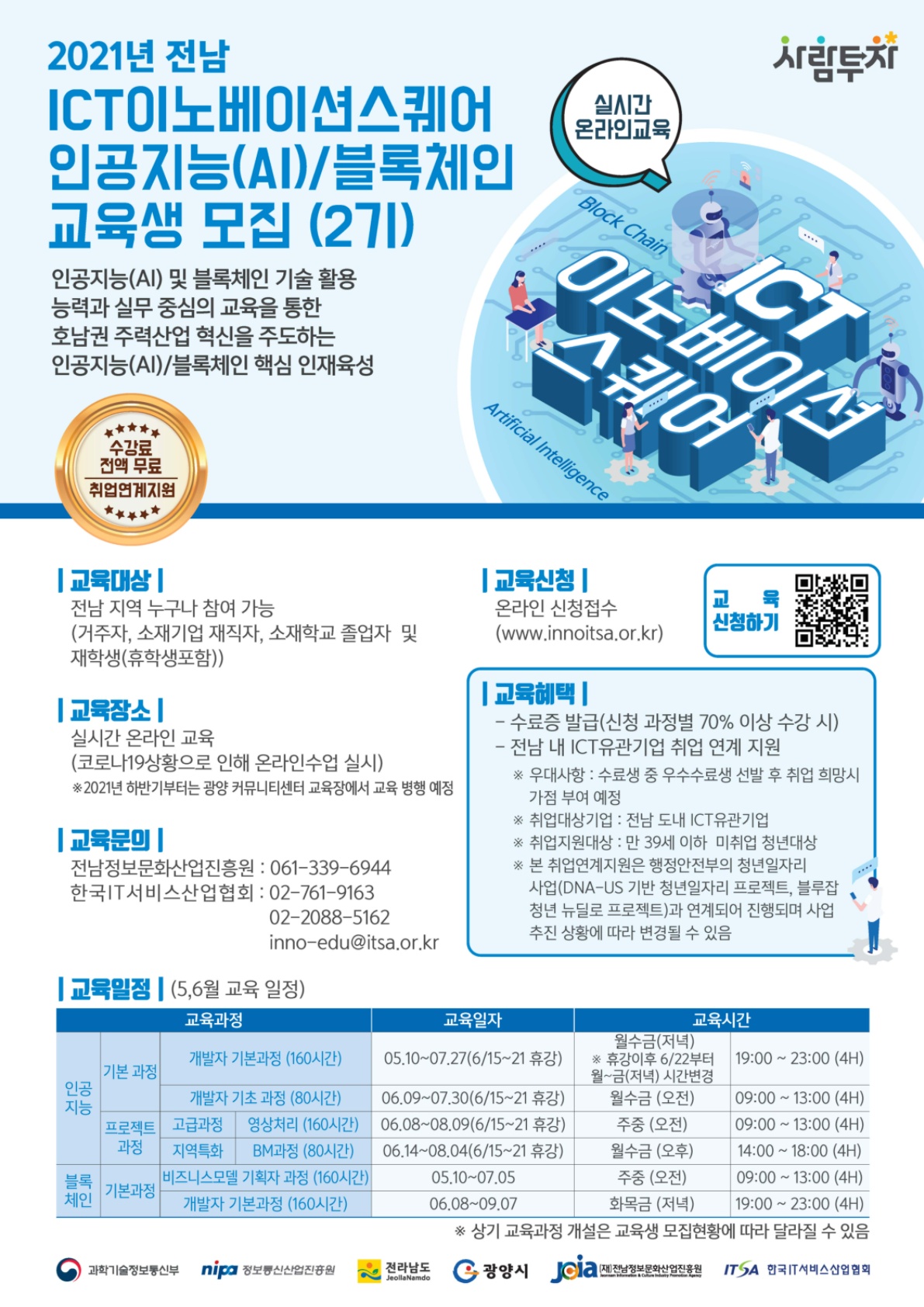 상반기에는 온라인 교육, 하반기는 광양시 커뮤니티센터 내 ICT이노베이션스퀘어 복합교육관에서 오프라인 교육을 진행한다. 관련 교육은 한국IT서비스산업협회 누리집(www.innoitsa.or.kr)을 통해 온라인 및 모바일로 신청가능하다. 자세한 사항은 전화(061-339-6927, 02-761-2061)로 문의하면 된다.