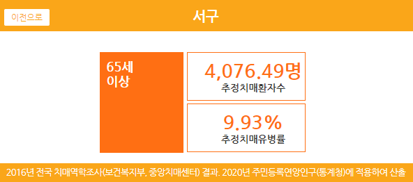 65세 치매 노인인구는 10명 중 1명 꼴이다. 광주 서구 지역내 추정 치매환자 수는 4,076명으로 치매 유병률은 9.93%으로 65세 이상 노인인구 약 10명 중 1명은 치매를 앓고 있다.