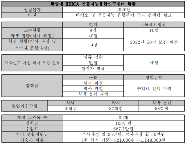 한양대학교가 인공지능대학원으로 선정된(서울캠퍼스) 데 이어 지난해 한양대 ERICA는 국책 인공지능융합연구센터로 선정됐다. 본교와 제2캠퍼스가 동시에 AI 국가 지원사업에 선발된 것은 이례적이다. 한양대 ERICA 김정룡 센터장은 일반대학원에 인공지능융합학과를 개설한 것이 AI 연구에 대한 강한 의지를 투영해 좋은 평가를 받은 것 같다는 후일담을 전했다.