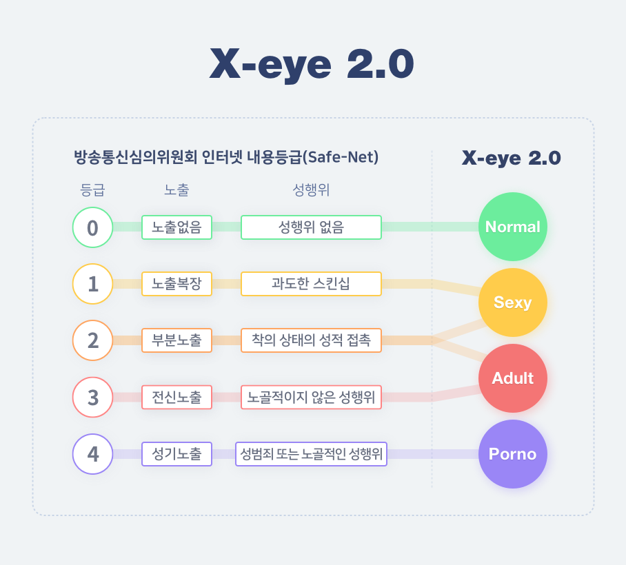 이를 통해 기존 정상과 음란으로만 구분하던 '엑스아이 1.0'이 정상, 음란, 성인, 선정 4가지 등급으로 커버리지를 확대해 더 높아진 정확도인 99.5%를 보였다.