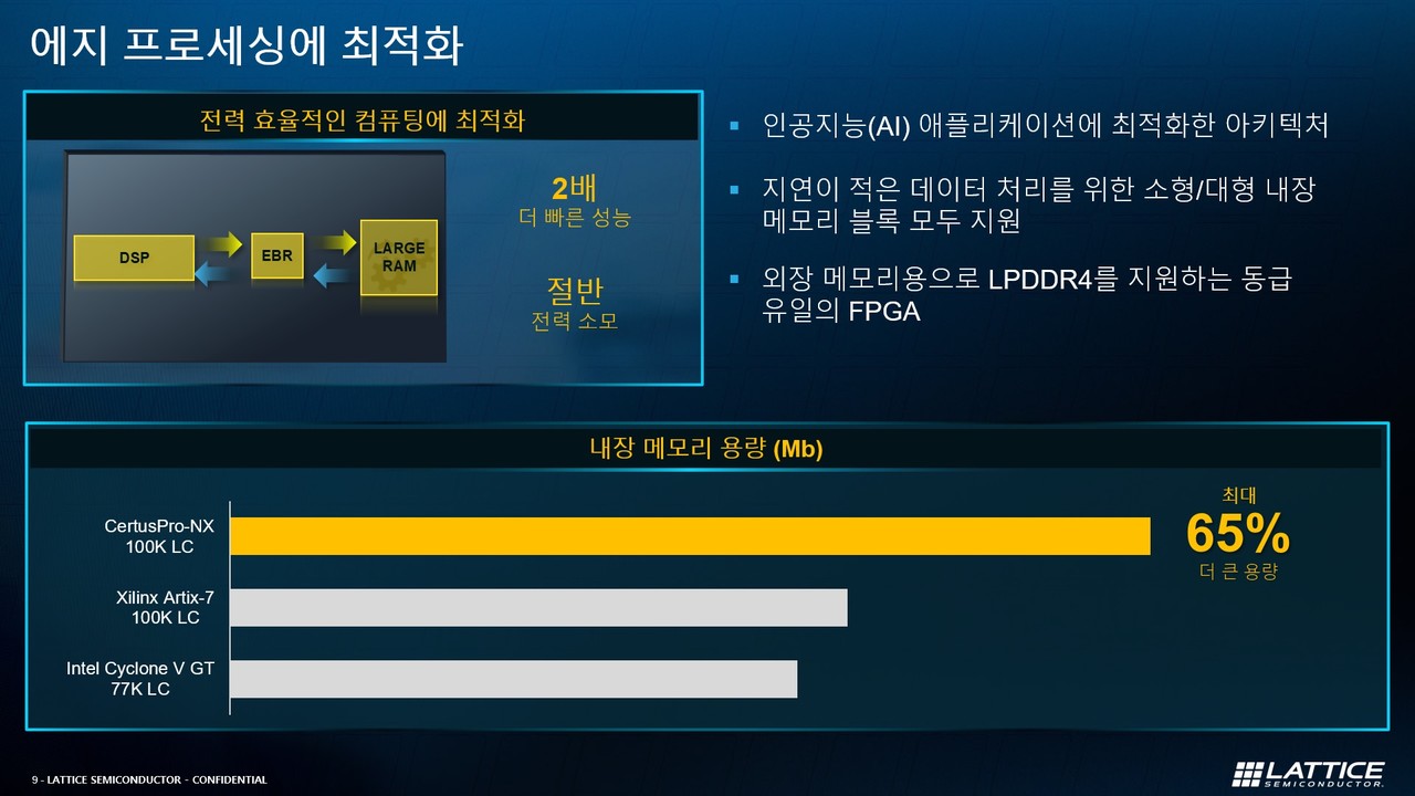 엣지 프로세싱에도 유리하다. 엣지 AI와 머신러닝 애플리케이션에서 데이터를 동시에 처리하기 위해서 다른 유사 FPGA보다 최대 65% 더 많은 내부 메모리 용량을 제공한다. 내부에 라지 램(Large RAM)을 사용해 외부 메모리 사용을 대체했다. 두 배 빠른 성능을 내면서 전력 소모는 절반으로 아낄 수 있다.