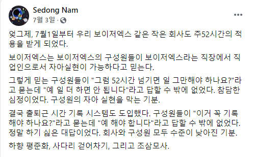 최근 '천재 개발자'로 알려진 국내 AI 스타트업 보이저엑스의 남세동 대표가 사회관계망서비스(SNS)에서 주 52시간 근무제를 공개적으로 비판했다. 남 대표는 "주 52시간 규제도 전혀 의도치 않은 미래의 결과를 맞이하게 될 것"이라고 밝혔다. 그러면서 "52시간 규제는 그들(직원들)에게 직장이라는 시공간을 마음껏 활용할 기회를 제한한다"면서 "하향 평준화, 사다리 걷어차기, 조삼모사의 미래가 걱정된다"고 지적했다.
