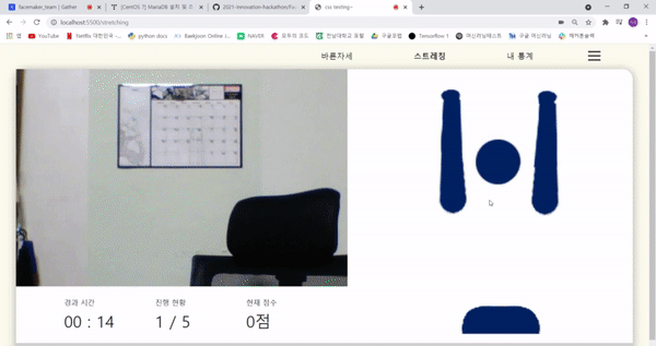 대회 전에 진행한 프로젝트에서 웹캠을 사용해 게임을 플레이하는 것을 실습해 보았다. 여기서 착안해 웹캠을 사용해 모션 인식을 통해 자세를 교정하거나 정해진 동작을 수행하게 하는 스트레칭 기능을 떠올리게 됐다.