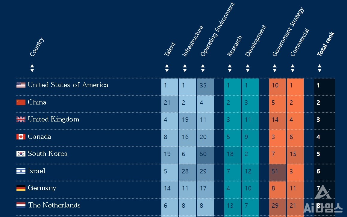 운영 환경은 각국 데이터 관련 규제 강도와 AI에 대한 사회적 신뢰도 등의 여론 지표를 반영돼 순위가 매겨진다. 한국의 경우 데이터 규제 문제가 해결되지 않은 탓에 낮은 점수를 받았다.