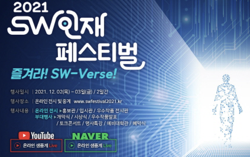 과학기술정보통신부(장관 임혜숙)가 'SW인재페스티벌 2021'을 2일부터 3일까지 양일간 개최한다. 이번 행사는 SW중심대학이 올해 이뤄낸 성과를 공유하기 위해 열렸다. SW에 관심있는 청소년과 학부모뿐만 아니라 일반 시민도 유튜브와 네이버에서 생중계로 볼 수 있다.