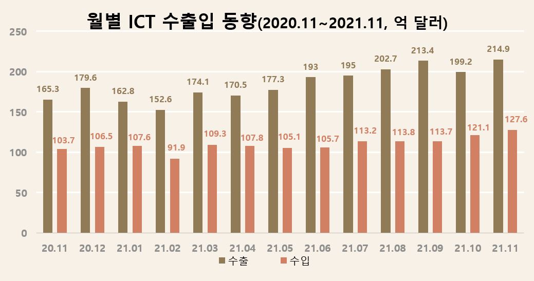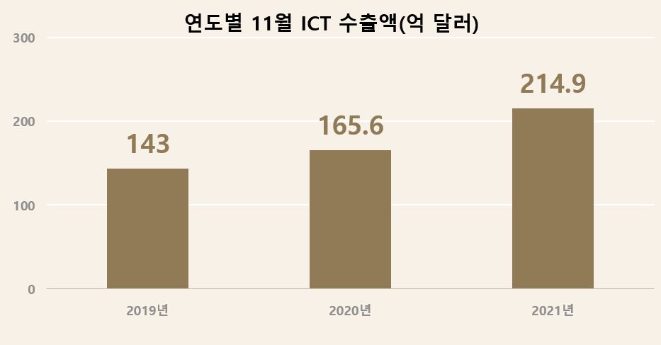 11월 정보통신기술(ICT) 수출액은 총 214억 9000만달러로, 역대 월별 수출액 1위를 달성했다.