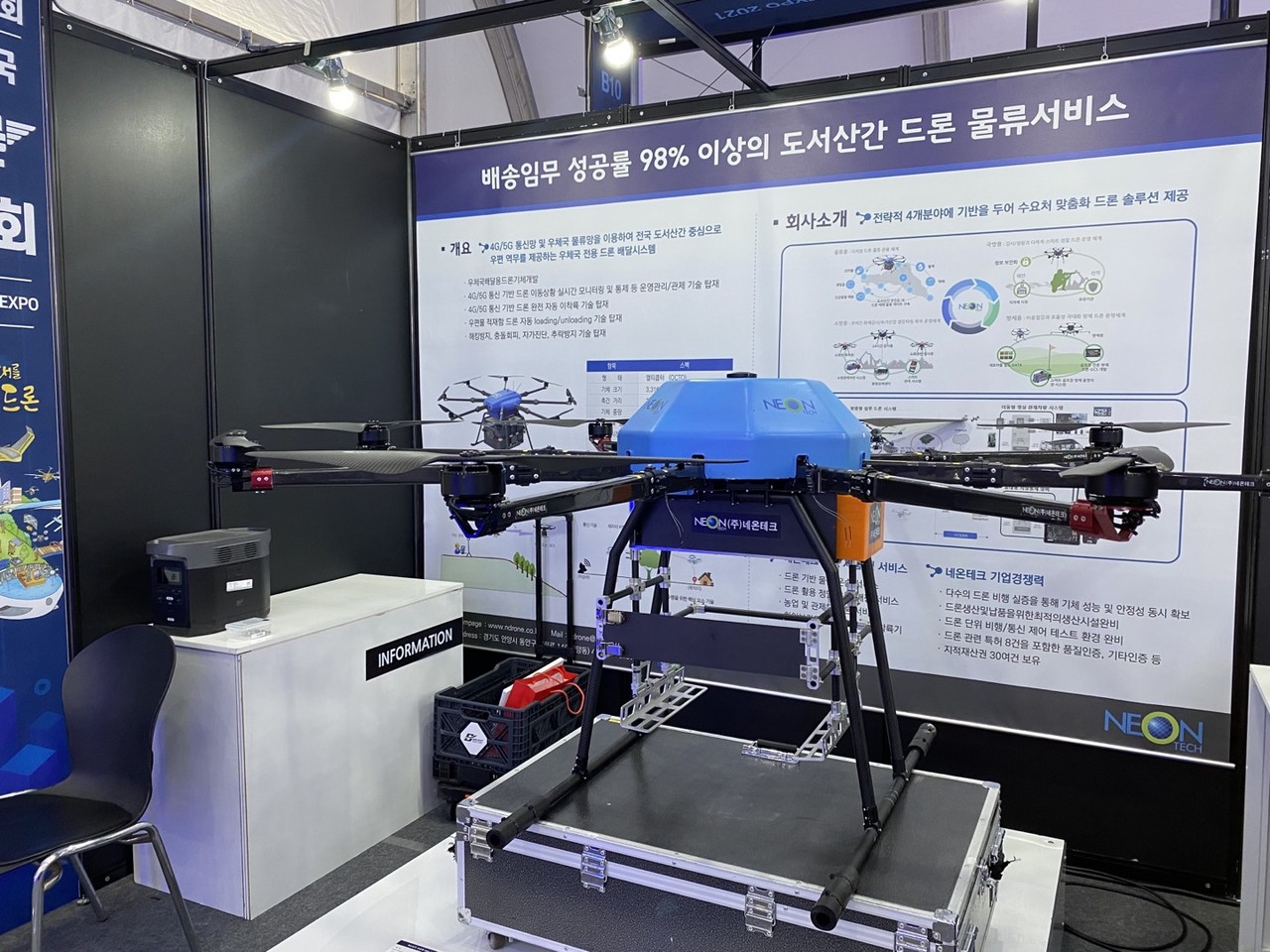 기업 ‘네온테크'에서는 우체국 전용 드론을 소개했다. 도서산간 중심으로 물류 제공이 가능하다. 우편물을 최대 80kg까지 들 수 있고 10km 거리를 왕복한다. 관계자는 “장거리인 만큼 충돌이 있어날 수 있다"며 “이를 대비해 해킹 방지, 충돌회피, 추락방지 기술을 탑재해 실증까지 마친 상태다"고 강조했다.