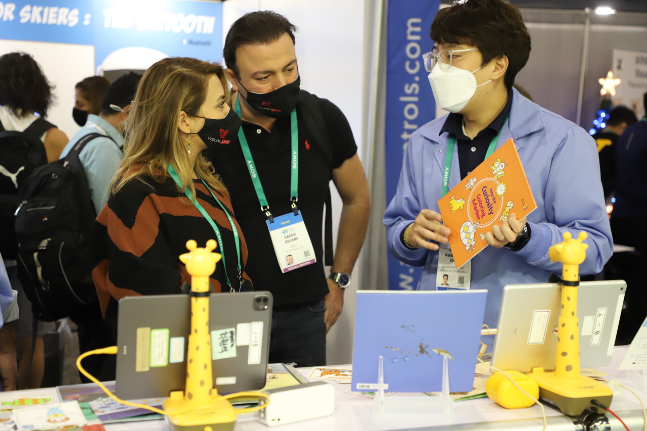 (미국 라스베이거스=AI타임스 김영하 기자) = 세계 최대 가전·정보기술(IT) 전시회 'CES 2022'가 열리는 6일(현지시간) 미국 네바다주 라스베이거스 컨벤션센터에 마련된 웅진씽크빅 부스. 한 해외 관람객이 웅진씽크빅 관계자에게 기술에 대한 설명을 듣고 있다.