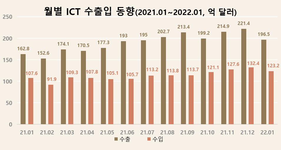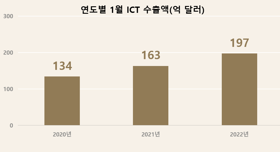 1월 정보통신기술(ICT) 수출입 성적표가 나왔다. 수출 규모는 전년 동기 대비 20.7% 상승한 약 197억달러(약 23조6400억원)를 기록했다. 역대 가장 큰 1월 수출 규모다. 과학기술정보통신부(장관 임혜숙)는 이 같은 내용의 ‘1월 ICT 수출입 동향’ 잠정 집계 결과를 14일 발표했다.